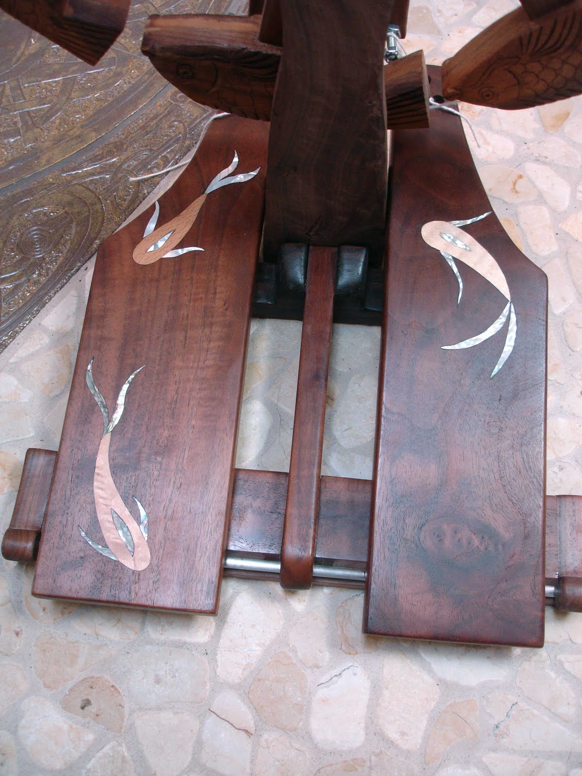 I'd neglected gravity a bit when I designed it so it wanted to lean backwards. I tried to compensate by adding extra wings on the base, but it still seemed flimsy. I finally gave in and designed a new base which is heavier and so makes it a little more heavy/complicated to pack up the wheel for travel, but it should still be able to be packed up for travel more easily than my saxony wheel. I have some more sanding/finishing to do as well as completing the flyers, but it is finally so close. I'm also thinking of inlaying the new base to match the treadles. Here's a close-up of the inlaid treadles: